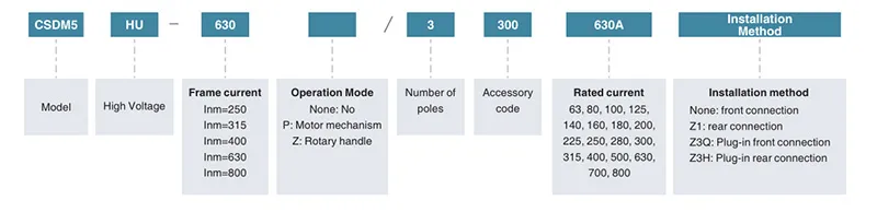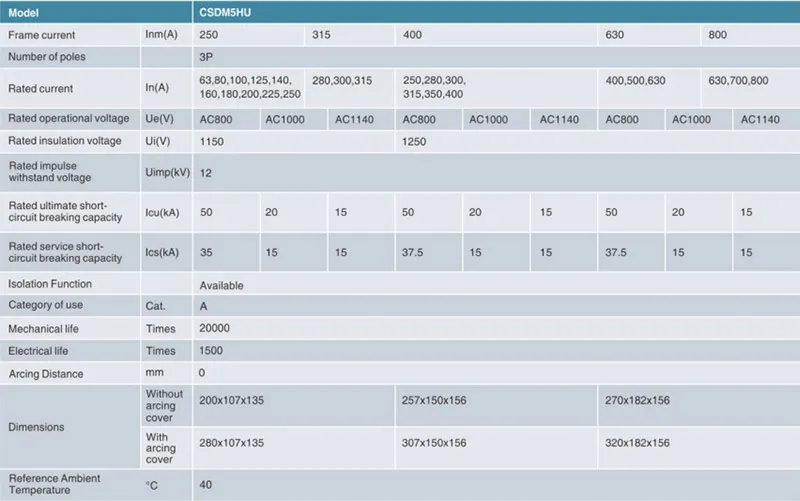 CSDM5HU series high voltage circuit breaker (referred to circuit breaker) is specially designed for high voltage electrical system with rated voltage up to 1140V and rated current 63A~800A. This circuit breakers can effectively protect electrical systems like the output loading of the string Inverters and others such as the loading capacity of the AC combiner box in the photovoltaic systems.