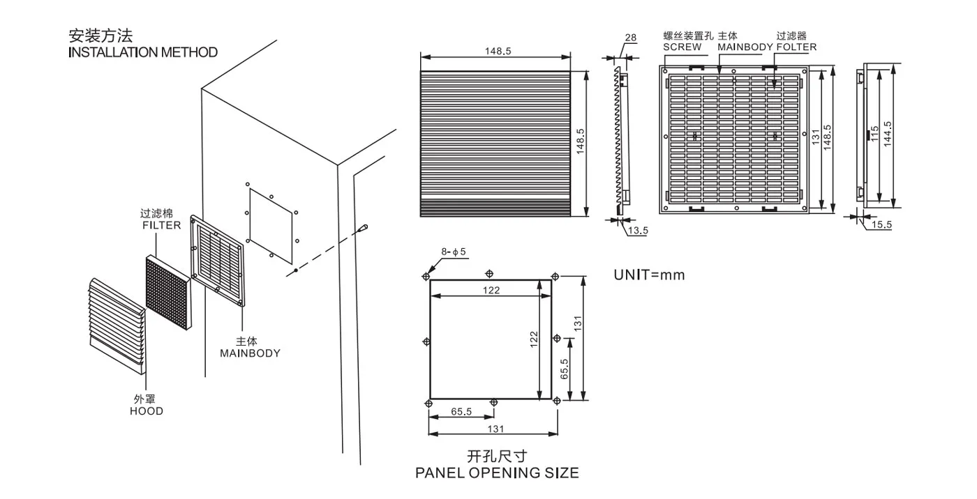 | Ventilation filter set | SF-8803 | 148×148.5×13.5 | - | - | 88 | 6.7-40 | -10-50℃ | ABS fire grade | IP54 | 156 | 80/92/120 Type |