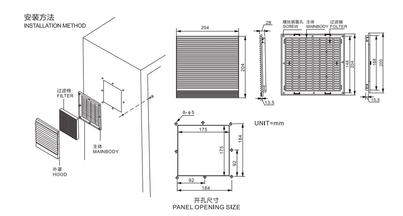 | Ventilation filter set | SF-8804 | 204×204×13.5 | - | - | 88 | 6.7-40 | -10-50℃ | ABS fire grade | IP54 | 276 | 120/150/1725 Type |
