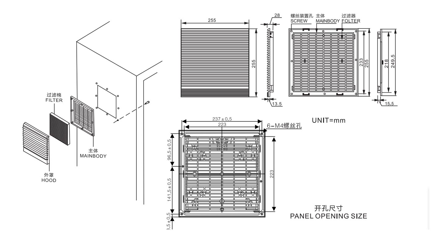 • Material: filter body made of flame retardant ABS resin, net made of foreign nylon fiber synthetic resin, with the anti-ultraviolet and static resistant performance, dust cleaning rate up to 86%, effectively prevent dust from access into electric cabinet.