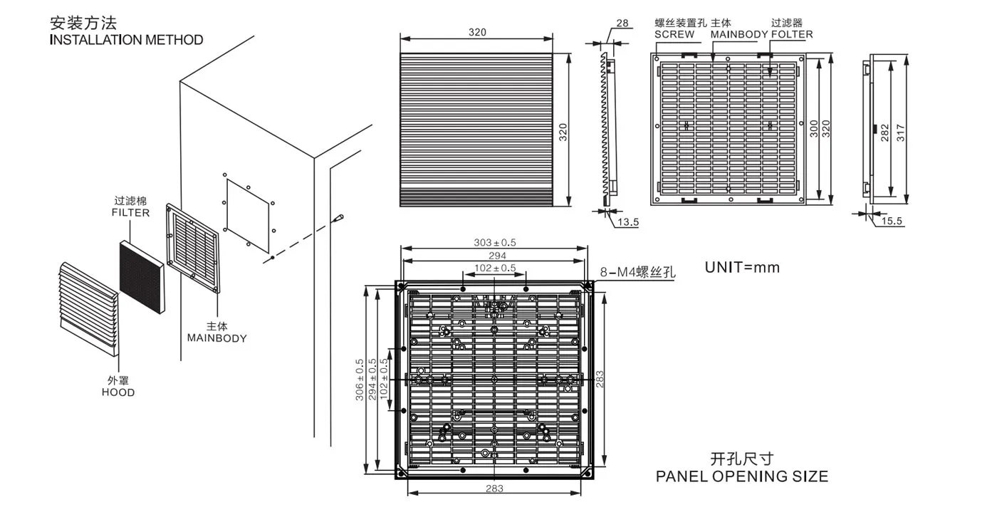 • Material: filter body made of flame retardant ABS resin, net made of foreign nylon fiber synthetic resin, with the anti-ultraviolet and static resistant performance, dust cleaning rate up to 86%, effectively prevent dust from access into electric cabinet.