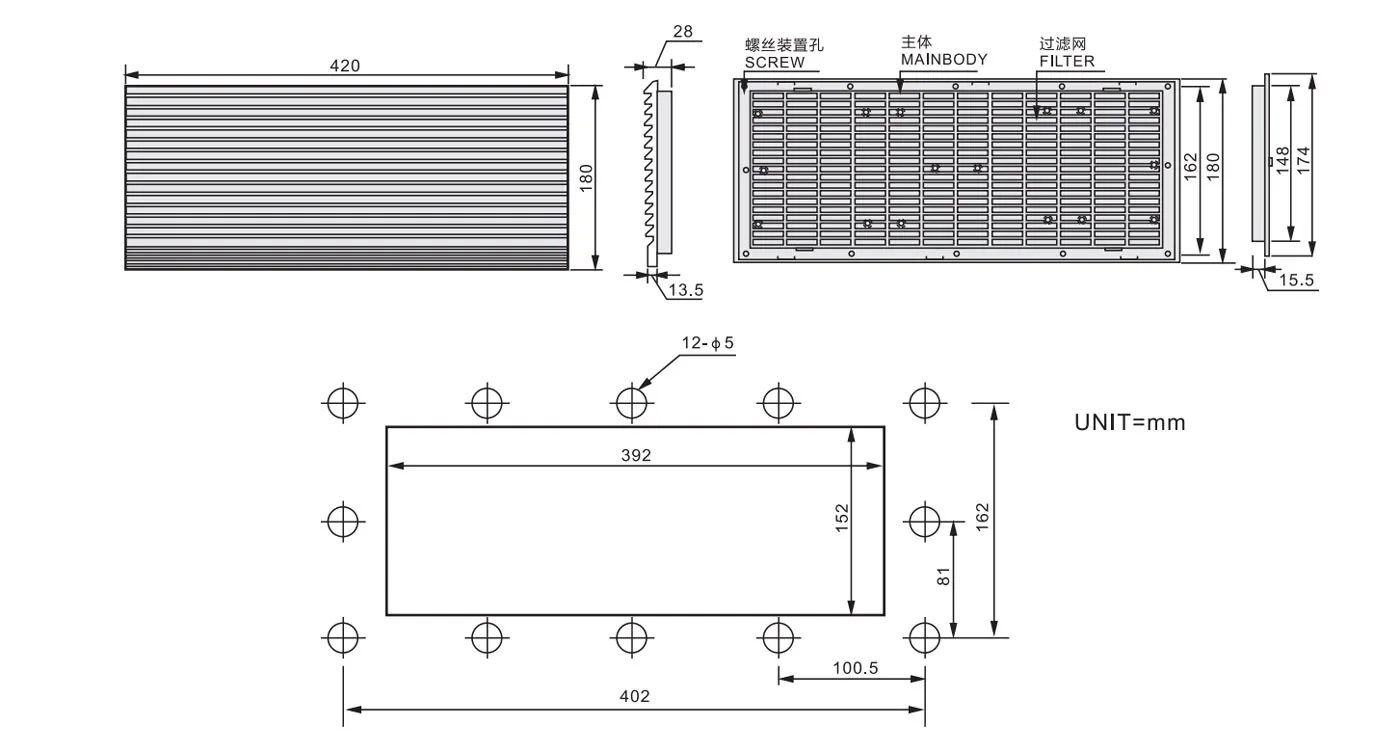 | Ventilation filter set | SF-8807 | 420×180×13.5 | - | - | 86 | 6.7-40 | -10-50℃ | ABS fire grade | IP54 | 518 | 120/1725 Type |