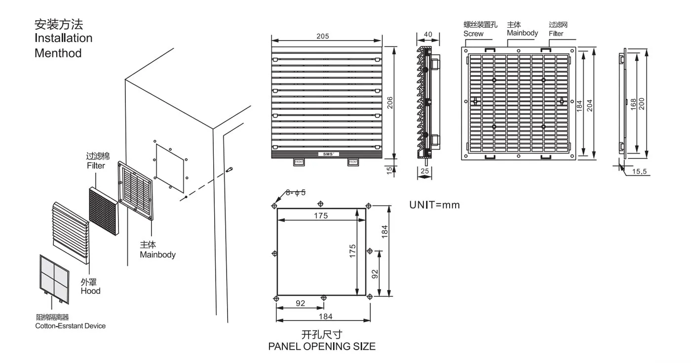 | Ventilation filter fan set | SF-8808C | 205×221×25 | 40.0 | 2.0 | 86 | 6.7-40 | -10-50℃ | ABS fire grade | IP54 | 418 | 150/1725 Type |