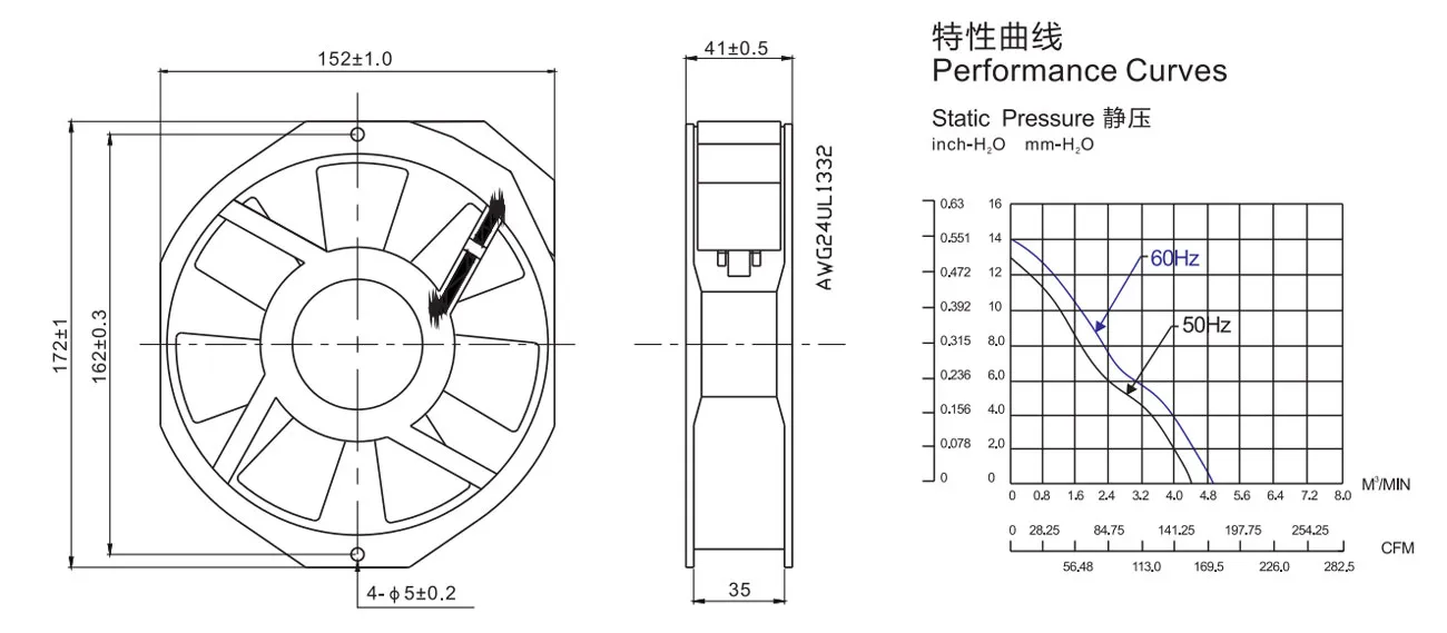 | Model | Bearing | Rated Voltage (V) | Freg (Hz) | Rated Current (A) | Input Power (W) | Speed (Rpm) | Air Flow (CMM) | Air Flow (CFM) | Static Pressure (mmH₂O) | Noise Level (dB-A) | Weight (G) | Quantity (PCS) |