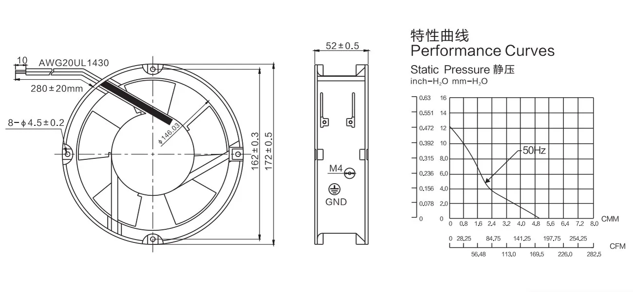 | Model | Bearing | Rated Voltage (V) | Freg (Hz) | Rated Current (A) | Input Power (W) | Speed (Rpm) | Air Flow (CMM) | Air Flow (CFM) | Static Pressure (mmH₂O) | Noise Level (dB-A) | Weight (G) | Quantity (PCS) |