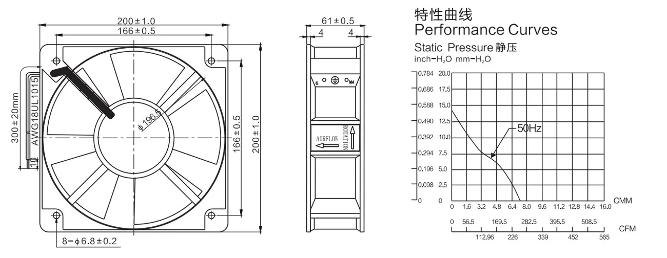 | Model | Bearing | Rated Voltage (V) | Freg (Hz) | Rated Current (A) | Input Power (W) | Speed (Rpm) | Air Flow (CMM) | Air Flow (CFM) | Static Pressure (mmH₂O) | Noise Level (dB-A) | Weight (G) | Quantity (PCS) |
