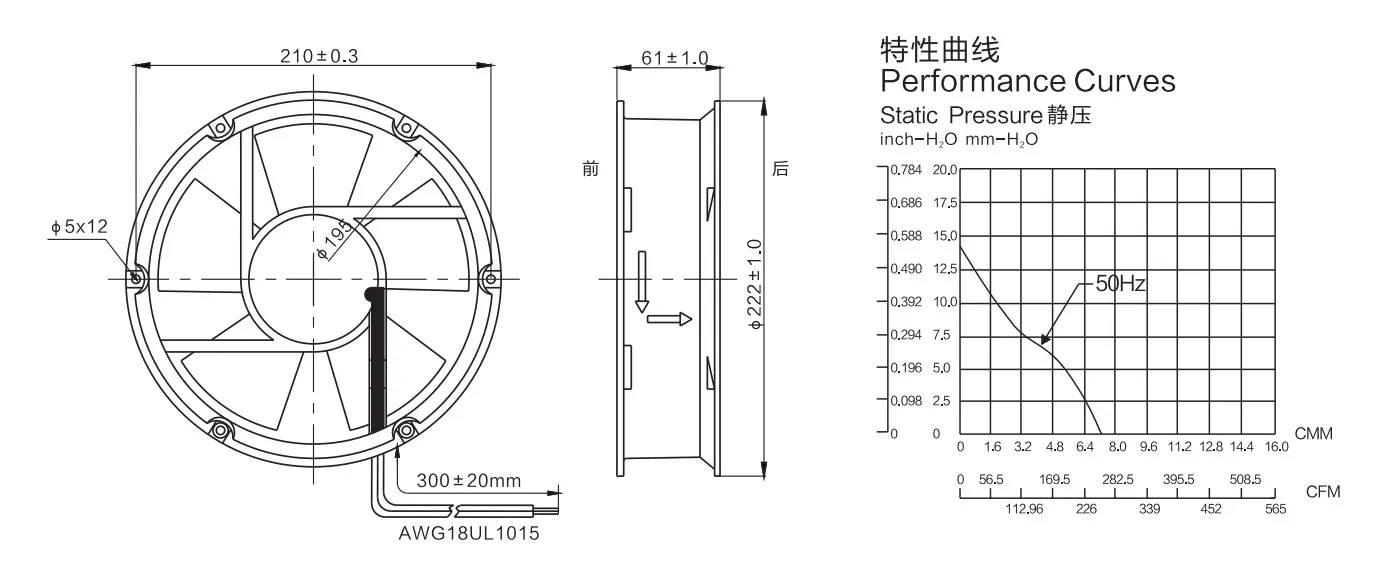 | Model | Bearing | Rated Voltage (V) | Freg (Hz) | Rated Current (A) | Input Power (W) | Speed (Rpm) | Air Flow (CMM) | Air Flow (CFM) | Static Pressure (mmH₂O) | Noise Level (dB-A) | Weight (G) | Quantity (PCS) |