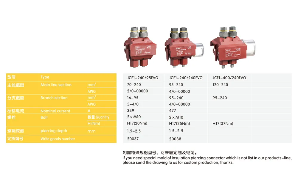 | JCF1-240/95 FV0 | 70-240 | 2/0-00000 | 16-95 | 5-4/0 | 377 | 2×M10 | H17(20Nm) |