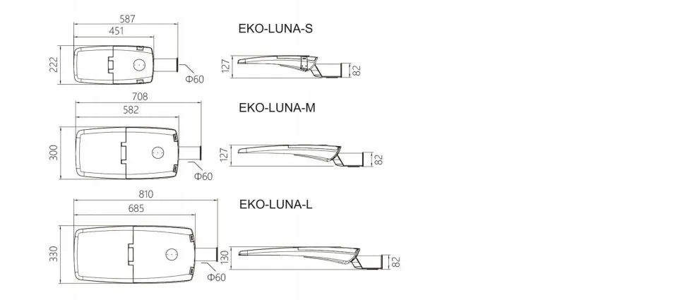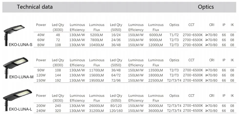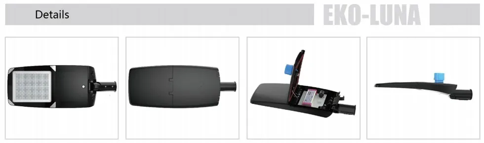 EKO-LUNA LED street light head is favored by the market for its high efficiency, energy saving, long life and excellent lighting effect. High light efficiency and low energy consumption greatly save energy and operating costs. Its exquisite design and solid structure can withstand the influence of bad weather and external environment.